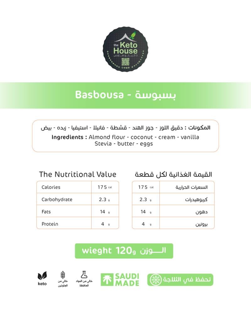 المكوناتدقيق اللوزجوز الهندقشطةفانيلازبدهبيضالقيمة الغذائيهالبروتين 4جرامالسعرات 175الدهون 14جرامالكارب 2.3 جرام تحفظ في الثلاجه